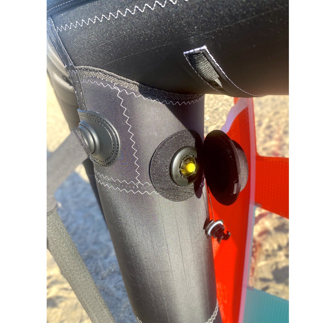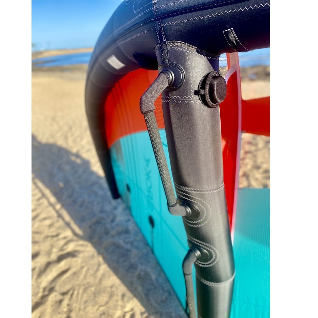 Elle est moderne, avec des poignées rigides qui facilitent le contrôle. Elle possède une double valve de gonflage. Celà permet de différencier les pressions de la latte centrale et du bord d’attaque. Pas de One Pump au programme mais un système efficace qui permet de la flexibilité.